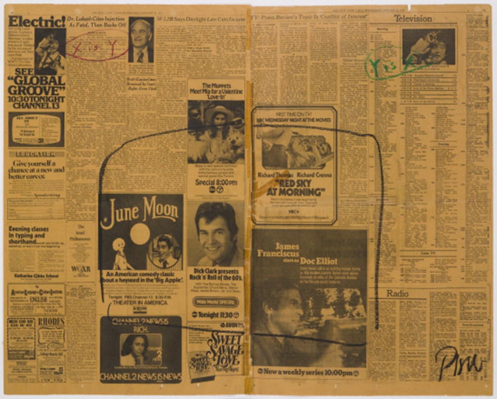 - Paik created x is y, y is x ― big drawing with TV on the TV guide pages for WNET’s broadcasting of Global Groove (1973) alongside the advertisement of the video art program, published in the New York Times on January 30th, 1974. Paik has put speech bubbles to his photographs printed on pages 70 and 71, respectively, and wrote “x is y” and “y is x” next to each picture. At the center of the two pages, the artist has also drawn a square, reminiscent of a television. The advertisement of Global Groove described video art as a new experience. The fact that video art was regarded as one of the TV programs is interesting, as this provides a hint of the climate of the 1970s when the audience of video art was not yet to be distinguished from those of TV programs.