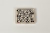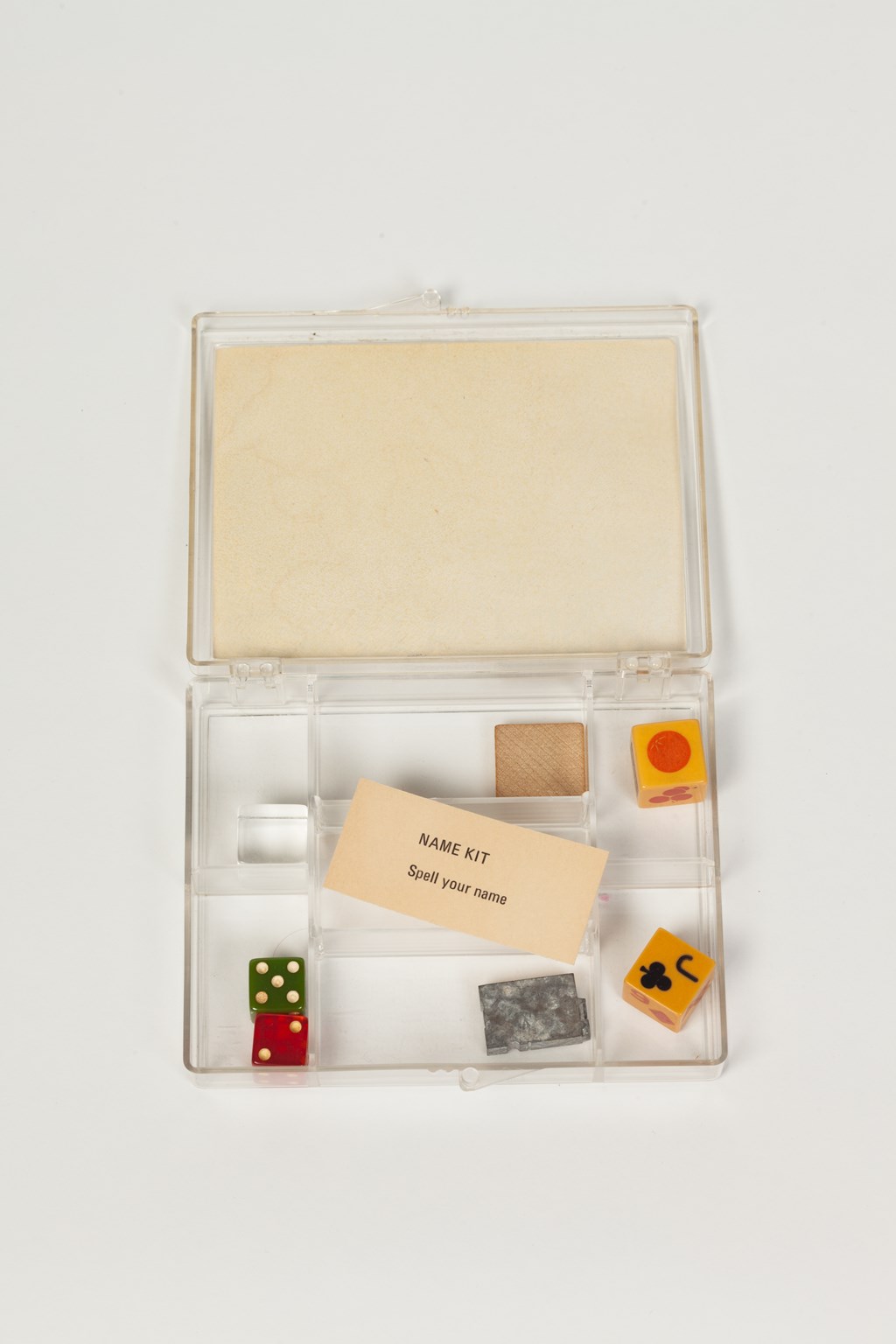 This Fluxkit is one of George Brecht’s Games and Puzzles entitled Name Kit. Inside are five small dices in different forms, two rubber stamps, and a piece of paper with the instruction, “spell your name.”