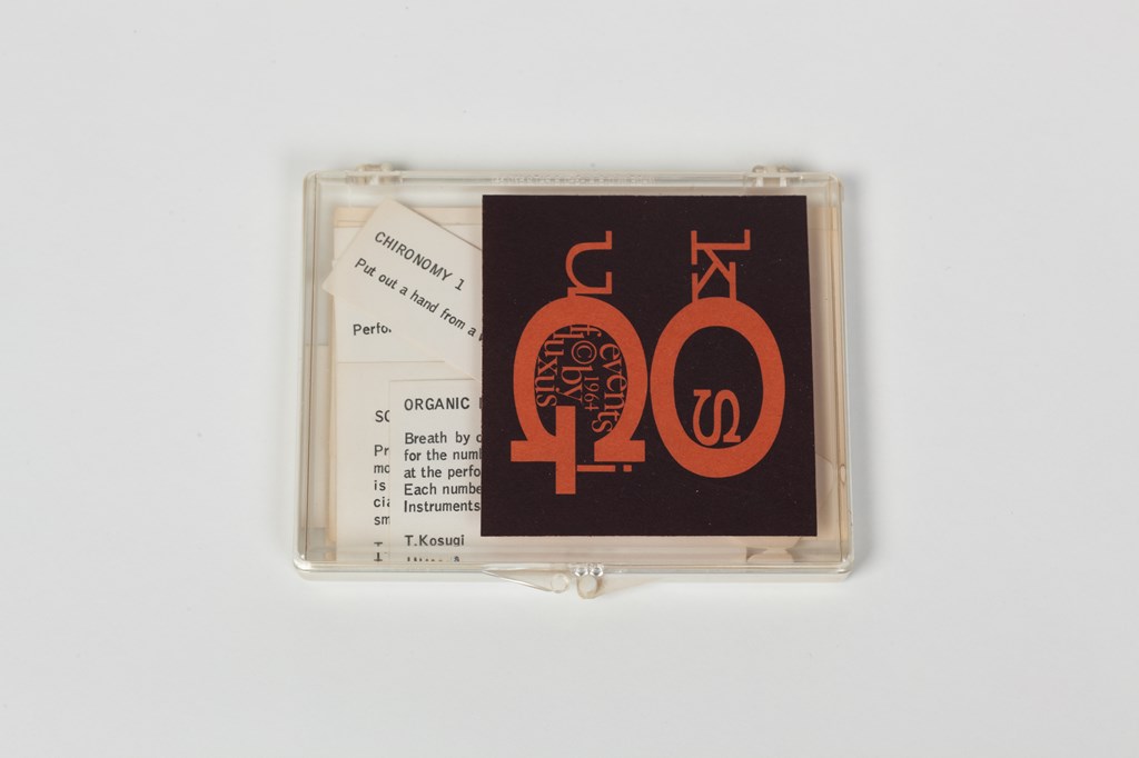 The plastic box of this Fluxkit contains thirteen offset cards of Takehisa Kosugi’s scores including: Chironomy No. 1 that instructs you to put out a hand from a window for a long time, as well as Organic Music and South.