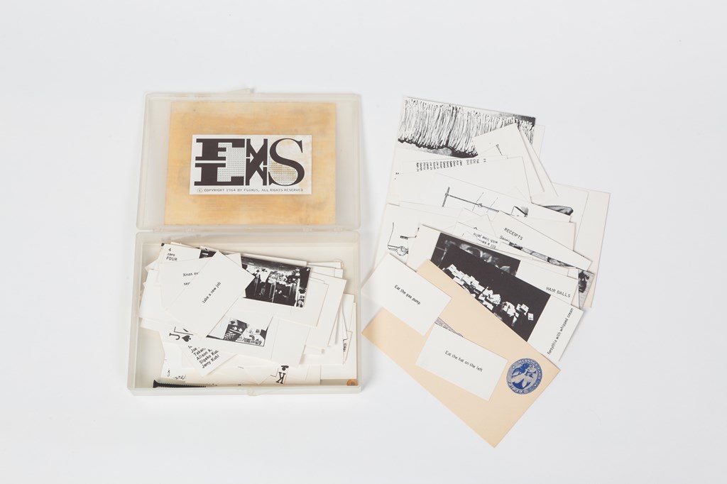 This Fluxkit is Events by Robert Watts. The box contains 71 instruction cards and one set of postage stamps. In 1961, Watts designed a perforated sheet of stamps with popular and erotic imagery, which has become the first example that incorporated postage stamps within the context of art. The most well-known is Fluxpost/17-17, the fourth set made up of 100 postage stamps. Watts’ stamp sets were often included in a Fluxkit, in whole or in part.