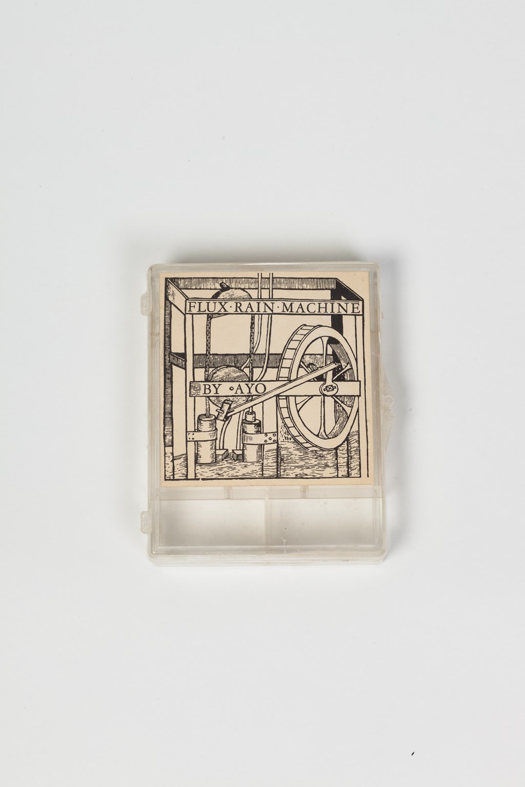 Transparent plastic box, label on the top, the box is closed with glue and contained a clear liquid. Edition Fluxus, N.Y.
